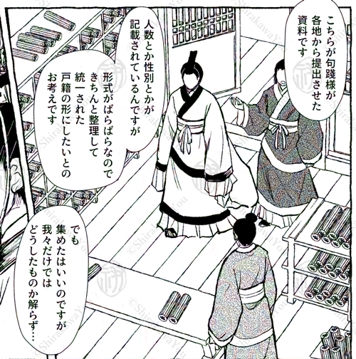 この作品では、越が小規模国家であることを生かして(?)戸籍を一括で管理し、中央集権化を図り、国を強化していくという流れになる予定です。ただ、これが史実かというと、そうでもありません。